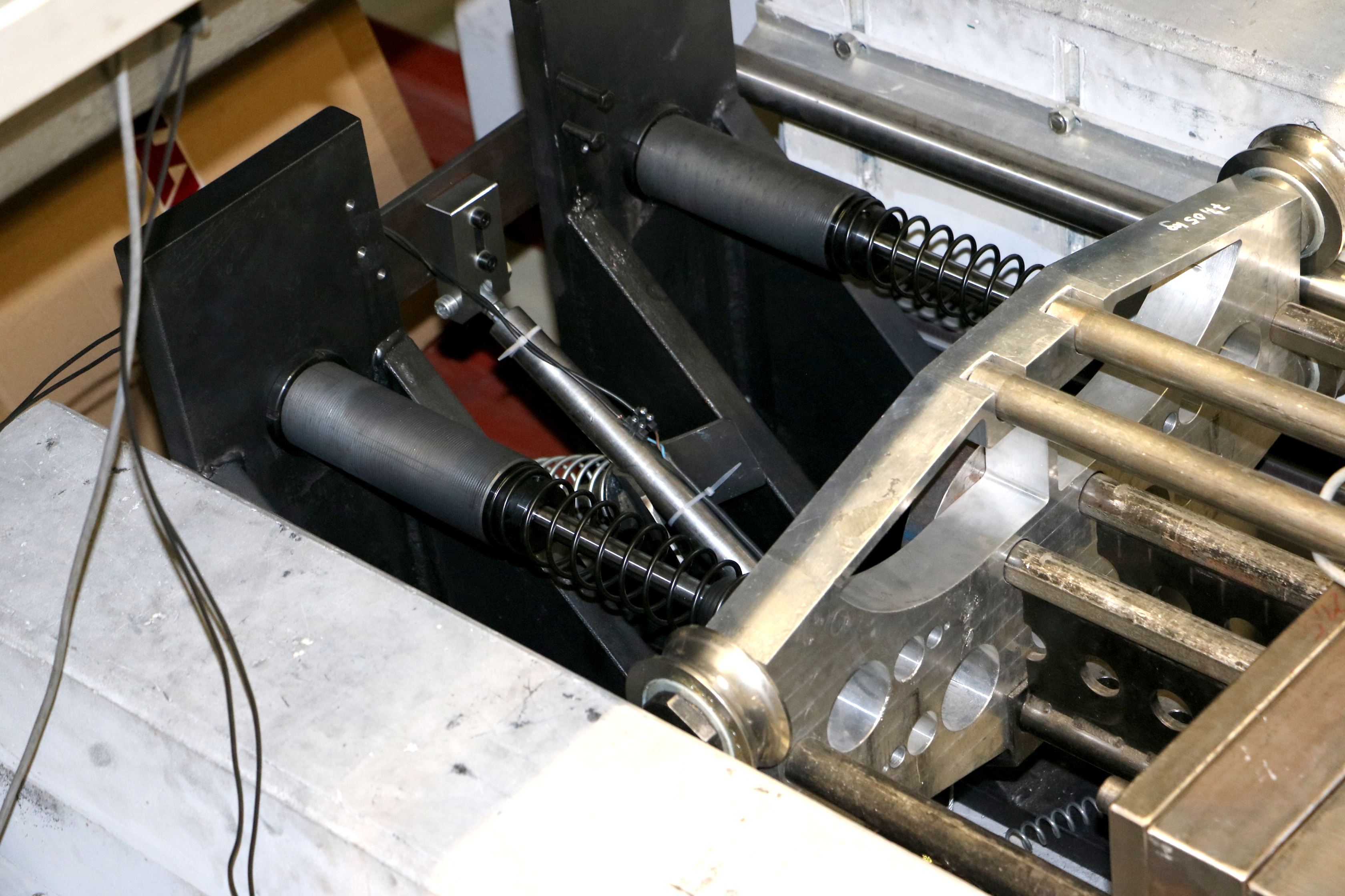 End position damping for hydraulic cylinders in test systems In a testing facility for vehicle tanks, the test specimens are pulled out of the water with a support arm. A hydraulic cylinder carries out the swinging movement and is attenuated in the end position by two TUBUS TR85-50. Even if this work could be taken over by other absorber solutions, the energy balance clearly speaks for the benefits of the profile dampers: they are inexpensive, they save space, they are free of leaks due to solid construction and are suitable for underwater functions in the test pool.